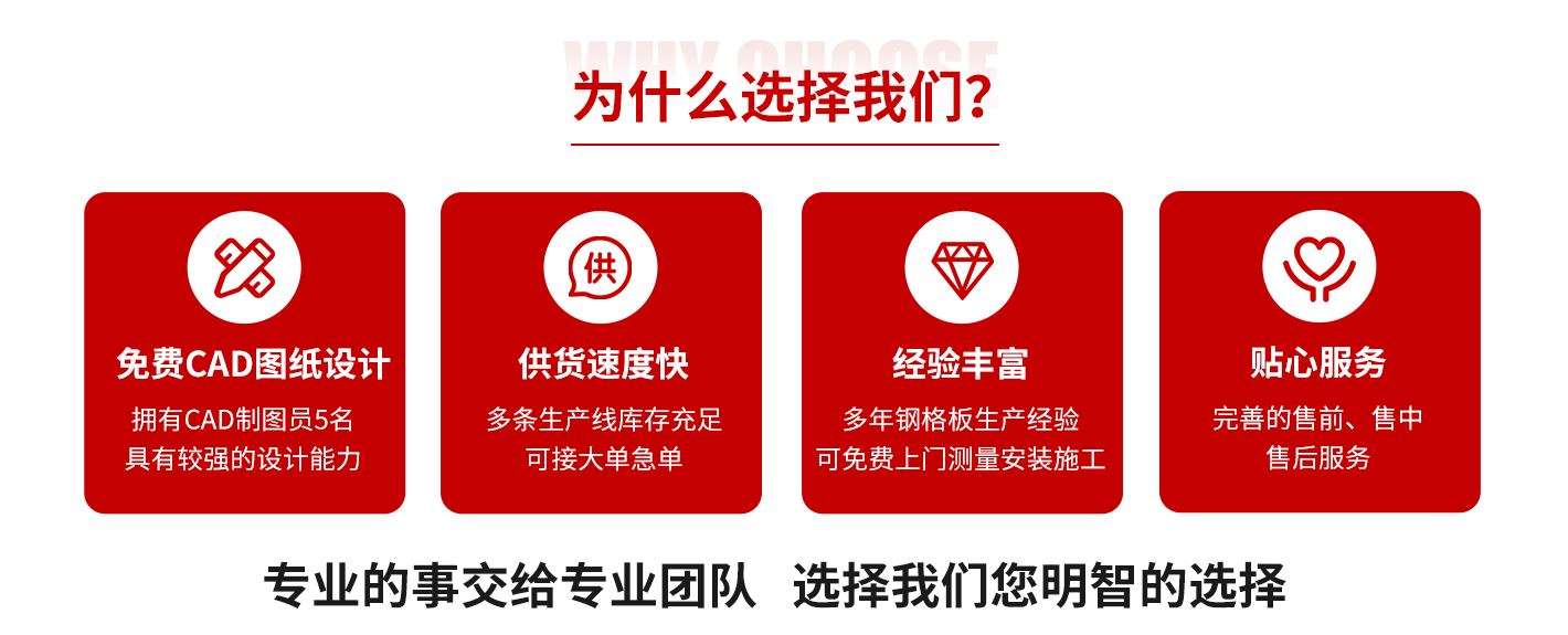 我公司是專業(yè)從事研發(fā)、制造、銷售:鋼格板(鋼格柵板)、鍍鋅鋼格板、密型鋼格板、不銹鋼鋼格板、玻璃鋼格柵、復(fù)合鋼格板、樹(shù)池蓋、溝蓋板、插接鋼格板、平臺(tái)鋼格板、特殊格柵板、踏步板、鍍鋅鋼格板等,產(chǎn)品適用于化工、港...